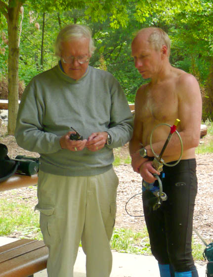 Barry Fox W1HFN (left) of Sterling, MA dropped by the practice session. He has been promoting all kinds of transmitter hunting in his area for several years. He got pointers on ARDF from several attendees including Nikolay Ivanchichin UR8UA (right).