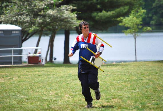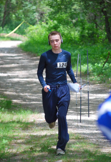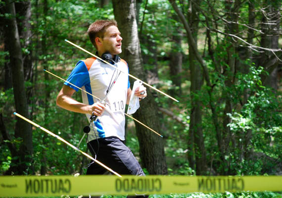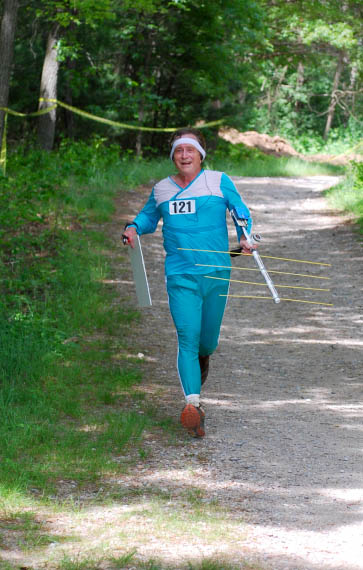 First-timer Ross Smith of the New England Orienteering Club sprints along the 2-meter finish corridor.