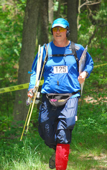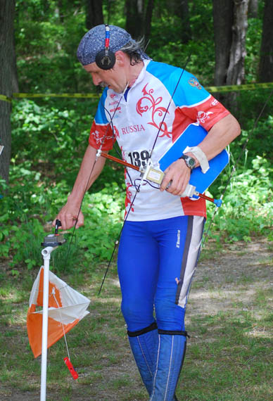 Igor Kekin of Russia doesn't appear winded as he punches in at the finish. Last year at the World Championships in Korea, he won gold in the M50 category. At these championships, he chose to run in the five-fox M21 category and this two-meter run earned him a bronze medal.