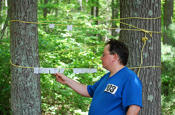 Ken Harker WM5R looks over the two-meter result slips. Upon finishing, each competitor downloaded his "e-stick" in two places, a printer that produced a slip to put on these strings and the computer that tabulated the final results.