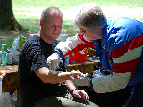 April Moell WA6OPS cleans up scratches on the arm of Herald Dettling DC1GB to prevent infection.