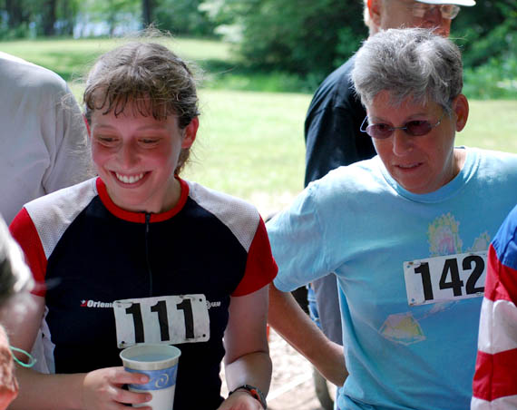 Lori Huberman (left) of New England Orienteering Club cools off after her gold medal winning run on two meters in the W21 category. At right is her mother, Ruth Bromer WB4QZG, who also earned gold in her category.