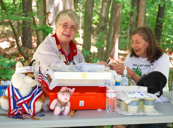 April Moell WA6OPS (left) and Winnie Hennigan KA6OFZ were ready at the finish line each competition day with electrolyte replacement drinks and first aid. April was also keeper of Ardee Fox (at lower left), the official Team USA mascot.
