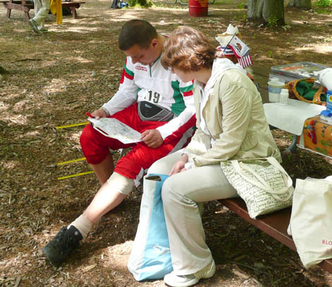 The medal hopes of Valeri Georgiev ended early when he sprained his ankle just after finding the first two-meter fox. After his injuries were wrapped, he stayed in the finish area with his daughter.