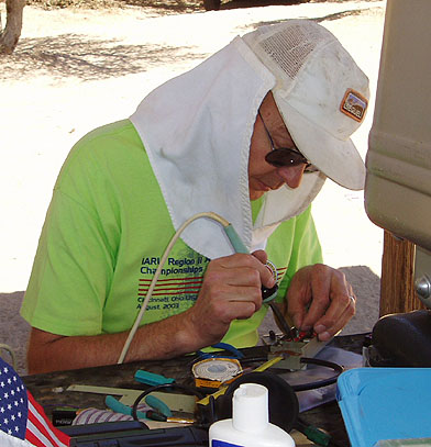 Harley Leach KI7XF made some on-the-spot improvements to one of the east European 80-meter ARDF sets. He brought a big battery and inverter to power his soldering iron.
