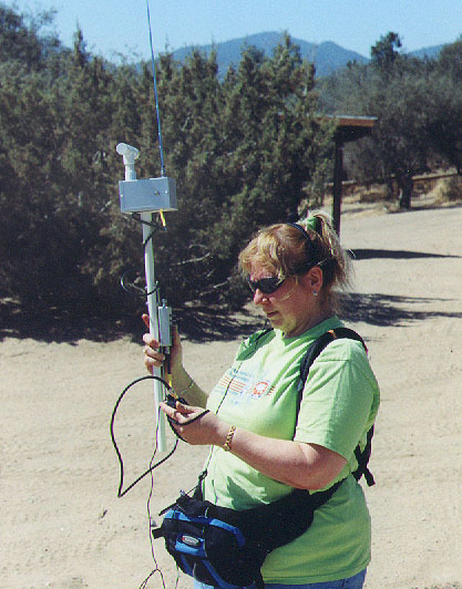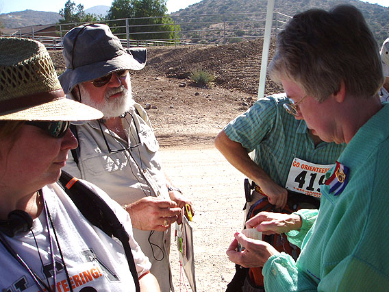 April Moell WA6OPS offered electrolyte tablets, sting relief packets and antiseptic swabs at the 2m start. Note the e-stick on the finger of Danny White W6DDW.