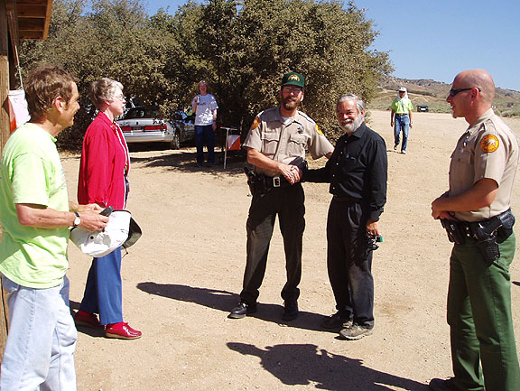 Equipment checkout day was Thursday at Hungry Valley State Recreation Area. Ranger Tom Tanner was curious what this group of mostly older adults was doing in his off-road-vehicle playground. When we explained ARDF and told him how environmentally-friendly it is, he gave us a big welcome. That's Event Chair Marvin Johnston KE6HTS shaking hands with him.