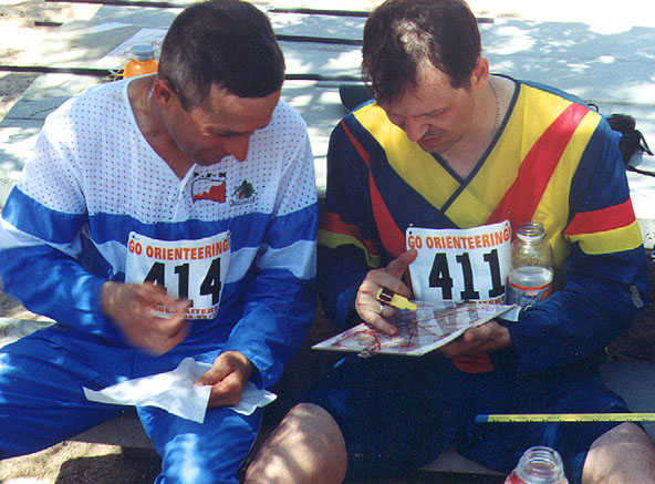 Bob Cooley KF6VSE downloads his e-stick in the e-punch tent and gets his 2m results sheet from Ananda Ranasinghe of Los Angeles Orienteering Club.