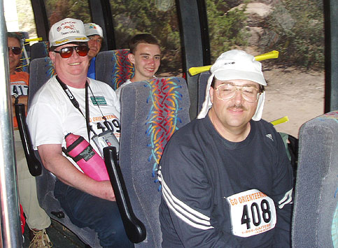 Tired but happy, competitors filled the bus seats for the ride back to Gorman after the 2m competition. In front is Bill Smathers KG6HXX. Behind him are Richard and Jay Thompson, WA6NOL and W6JAY.