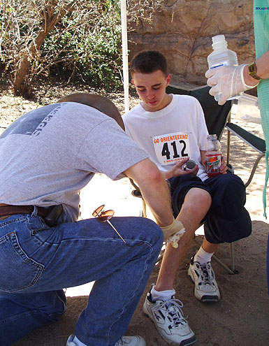 Jay Thompson W6JAY ran through the brush to get a medal, plus some scratches on his legs. Volunteer medic Jon Schaffer, R.N. W6UFS applies the antiseptic.
