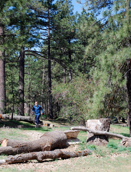 Jay Hennigan WB6RDV heads out onto the two-meter training course with his log-periodic antenna, carefully avoiding the fallen tree limbs.