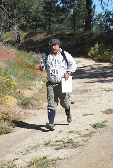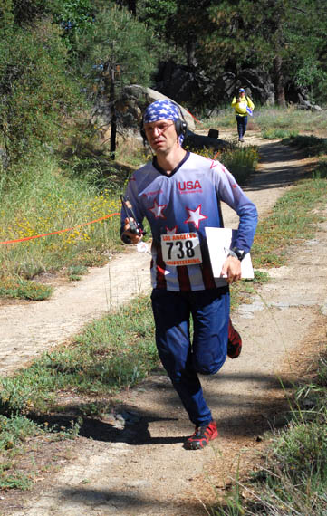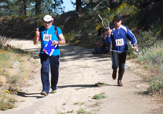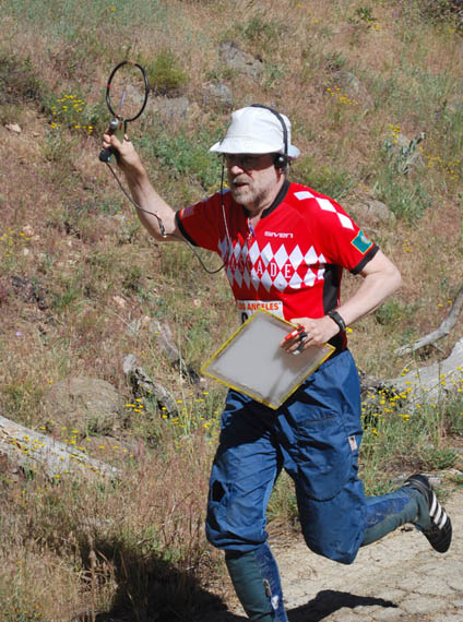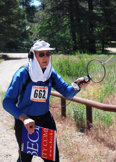Carrying his home-built 80m ARDF set is Scott Moore KF6IKO. He will get a bronze medal in M50.