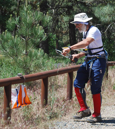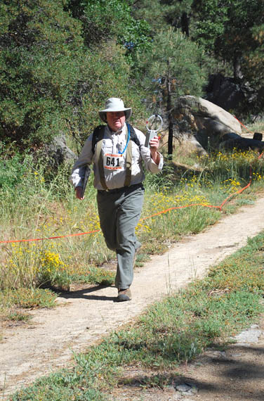 Joseph Huberman K5JGH is about to punch in and get a bronze medal in M60. Note the map holder strapped around his chest.