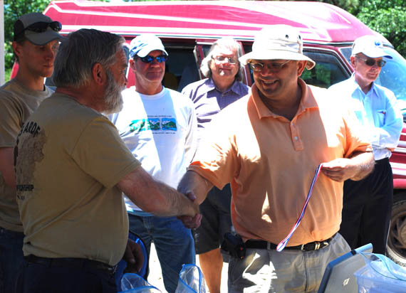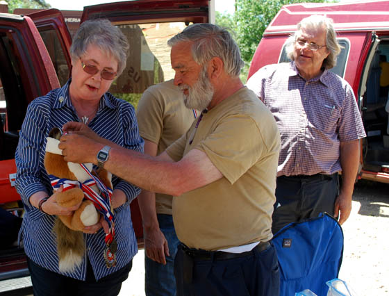 Thanks to electronic scoring, the medal ceremony took place immediately after the 80m competition so many participants could catch their flights to home. Matthew Robbins AA9YH accepts his bronze medals for both two meters and 80 meters in M40 category.