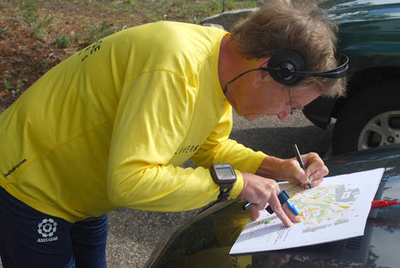 The trails on the Oak Flat map were hard to see, so Jay Hennigan WB6RDV traced them in darker ink. Jay is an experienced radio-orienteer and marathoner from California who has been to the World Championships several times, but he never misses an opportunity to train.