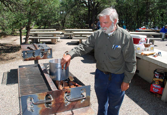 Dale Hunt WB6BYU (right) discussed the course he just finished with Jerry Boyd WB8WFK as they waited for the tri-tips to come off the grill. As Co-chair of the organizers, Jerry had many duties including course-setter for both the training sessions and the competitive venues. He also did lots of mapping and field checking.