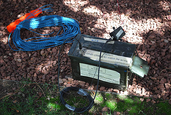 Here is one of the 80-meter fox transmitters in a waterproof ammunition box. The antenna is a vertical wire with an impedance-matching network at the base. The transmitter operator throws the weighted rope up into a tree, then hauls up the antenna wire.