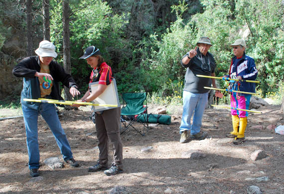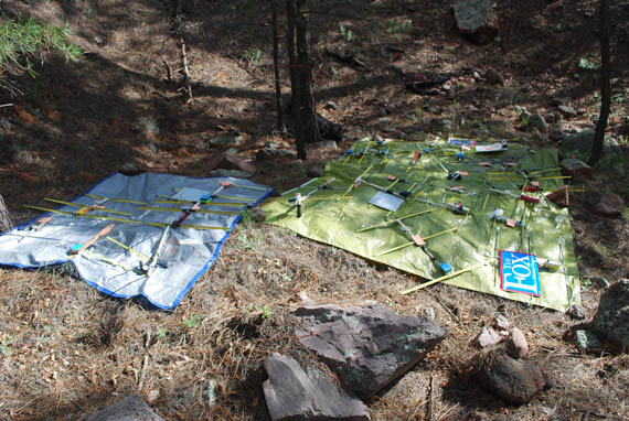 Receivers are impounded so that nobody will turn them on before starting. Volunteers from Los Alamos Amateur Radio Club (LAARC) helped competitors mark their two-meter gear and put it on the tarp.