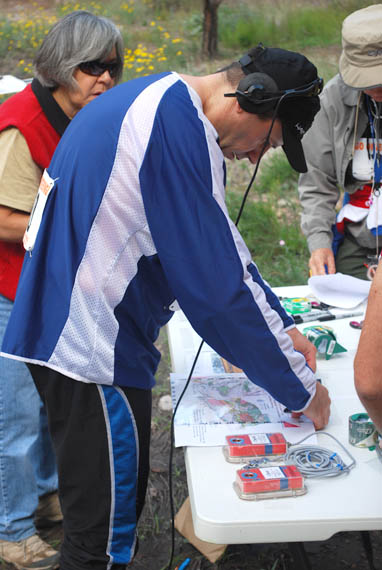 Ten mimutes before starting, Nicolai Mejevoi prepares his 11 x 17 inch map for the two-meter hunt. On the edge of the table are the CLEAR and CHECK controls for the electronic scoring system. They clear the competitors' "e-sticks" of previous events' data.