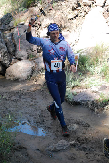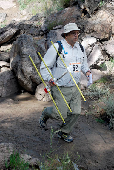 Vadim Afonkin KB1RLI of Boston, Massachusetts holds his antenna high and avoids the rocks in the corridor.
