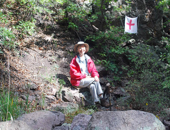 Joan Rogers KC5BPI of LAARC helped with First Aid on Saturday. First, she stationed herself in the middle of the rocky starting corridor.