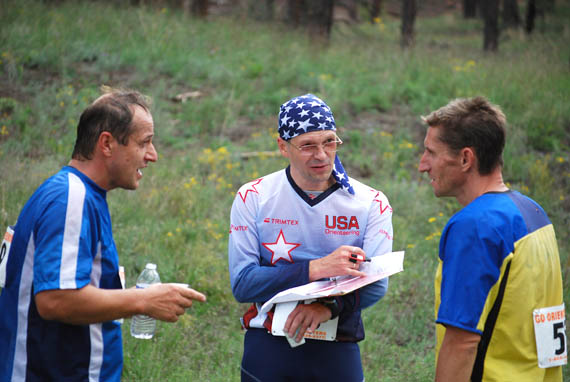 After finishing, Vadim Afonkin KB1RLI (center) discusses the course with Volodymyr Gniedov and Kostiantyn Zolochevskyi, the two Ukrainians.