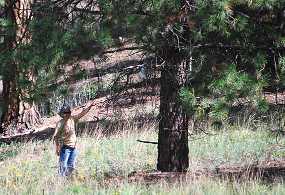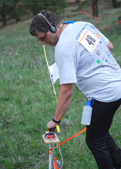 Volunteer Anne Browning KD5NLN of LAARC points to the homing transmitter at the entrance to the finish corridor. This transmitter helps competitors who get lost or lose their maps. There is a control station next to this transmitter that the competitors must punch to prove that they traversed the entire length of the corridor as their route to the finish.