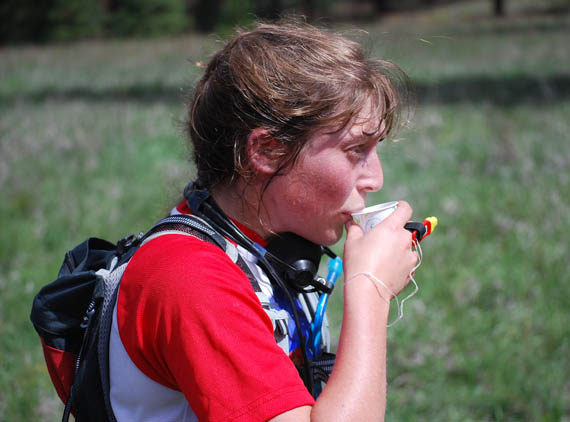 Lori Huberman of Cambridge, MA got rehydrated after her R2 gold medal winning run in W21 category.