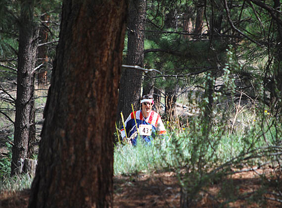 Here comes Bob Frey WA6EZV of Jacksonville, FL through the woods toward the finish beacon.