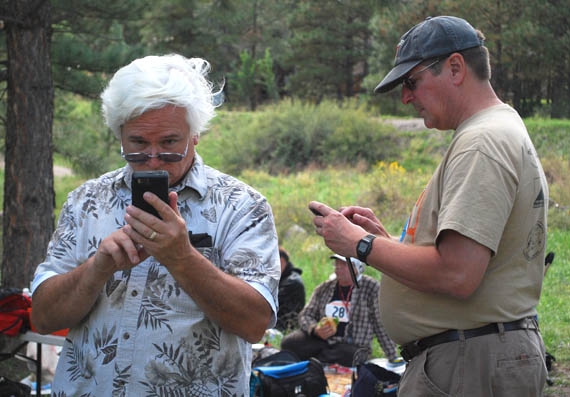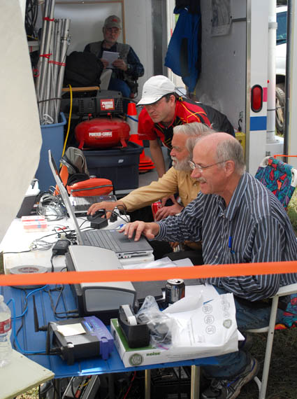 After finishing, competitors downloaded their electronic scoring sticks. Their results were immediately available to everyone, thanks to the new FjwW software and a Wi-Fi broadcast. Jerry Boyd, WB8WFK (closest to camera) operates the FjwW computer. Next to him is Marvin Johnston, KE6HTS operating a backup scoring system with SportIdent software. Observing is Matthias Kuehlewein, DL3SDO.