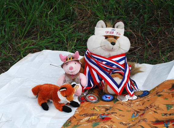 Ardee Fox and Hamlet, USA's official ARDF mascots, presided over the finish area as always. Ardee is getting neck strain from all of his medals from previous USA championships.