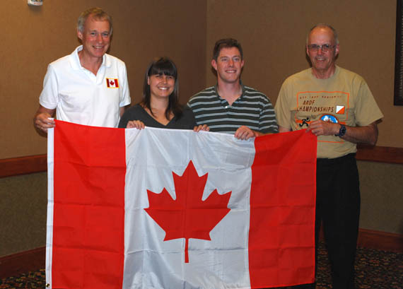 The traditional championships "banquet" took place at the event hotel on Saturday evening. The Canadian team posed with its flag. Left to right are Nick Roethe DF1FO, Stevie Van Skiver VE7SMX, Grant Van Skiver VE7GVS and Keith Witney VE7MID. Although Nick lives in Germany now, he was born in Canada.