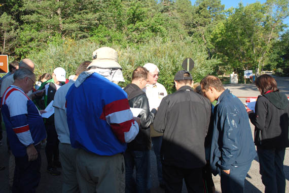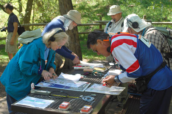 Mounting and marking maps at a picnic table near the starting line.