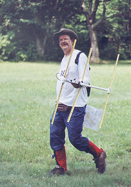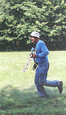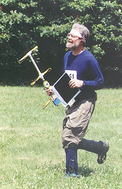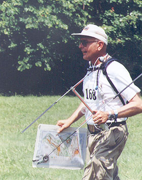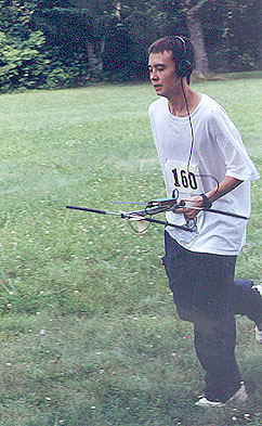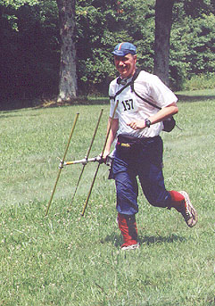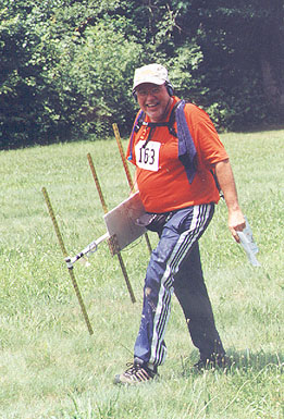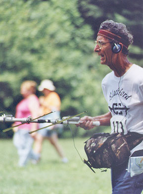 Coming down the final stretch is Dale Hunt WB6BYU. He has found all his transmitters and has folded up his antenna to help him run faster.