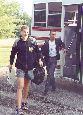 The bus ride to the 80-meter competition site on Saturday was much shorter than the day before. Daniel Nagy (left) and his father Gyuri HA3PA/KF6YKN are getting off, ready for the hunt at Mounds State Recreation Area on the Brookville Reservoir in Indiana.