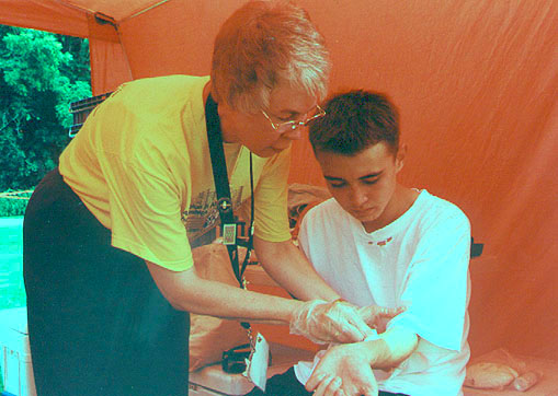 April Moell WA6OPS provided first aid to Jay Thompson W6JAY in the red tent after the 80m hunt. Jay had earned an IARU Region 2 gold medal in M19.