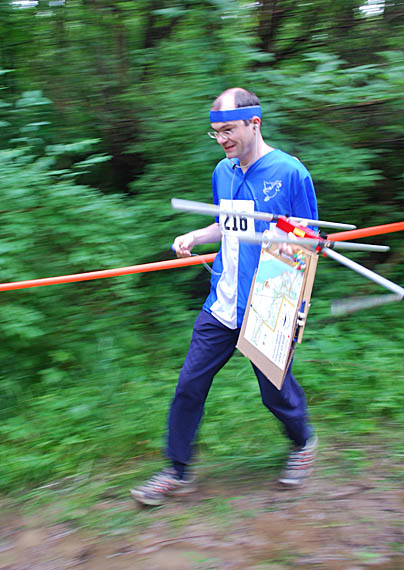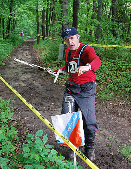 Paul Gruettner WB9ODQ of Milwaukee, WI screeches to a halt before punching in at the 2m finish. This was his second USA ARDF Championships.