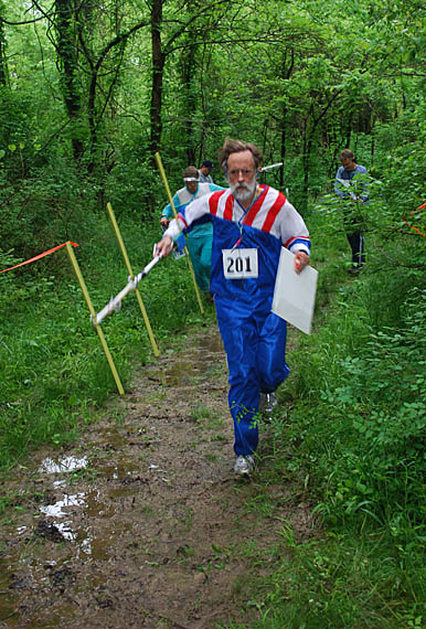 Long-time competitor Csaba Tiszttarto sprints along the muddy trail/corridor to the finish line.