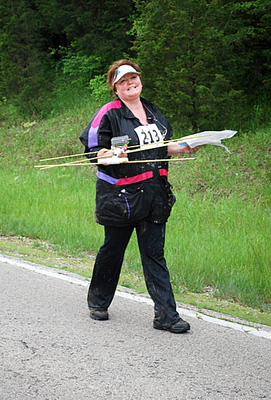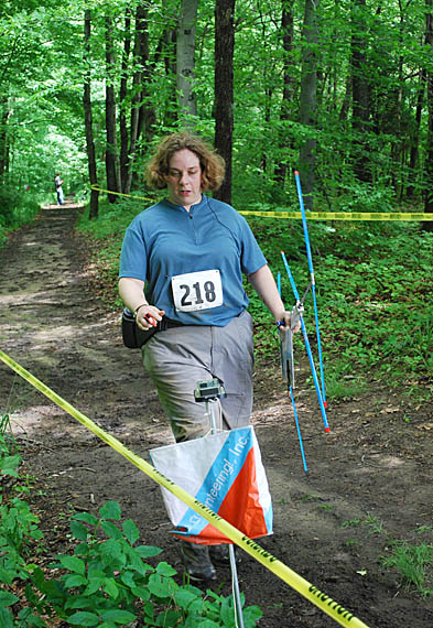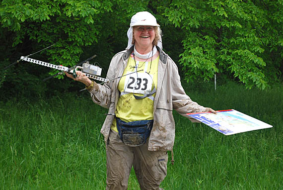 "I just did a face-plant!" That's what Karla Leach KC7BLA told me as she emerged from the very wet woods onto Main Loop Trail during the 2m hunt. Fortunately she wasn't injured, her equipment wasn't damaged, and she went on to earn a silver medal.
