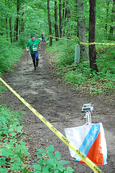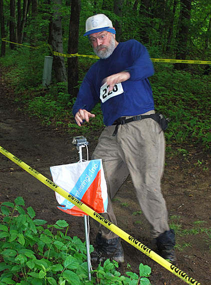 Dale Hunt WB6BYU almost overshot the finish control. He's not carrying his two-meter set because he had thrown it to the ground one second earlier. It wasn't out of anger -- he just didn't want it in his way as he decelerated rapidly. Dale captured overall silver in M50 category.