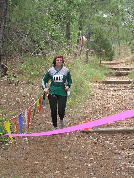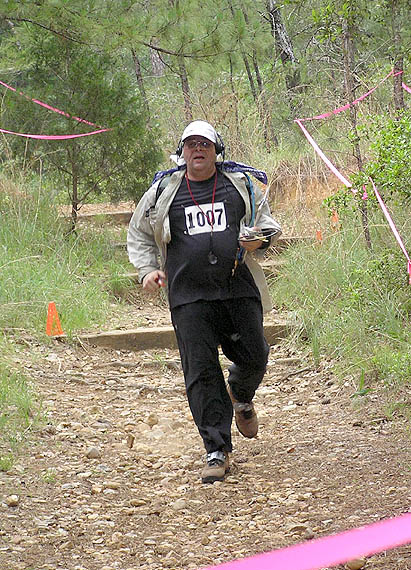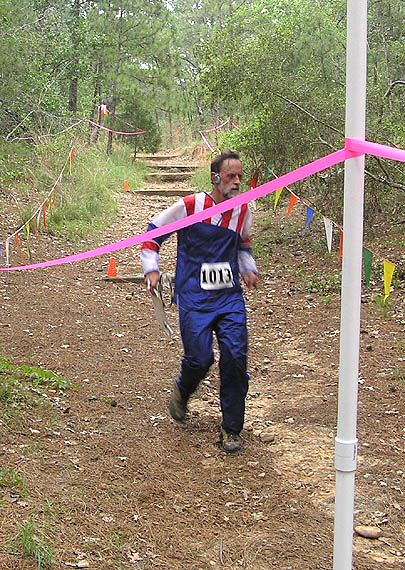 Bill Smathers KG6HXX runs down the finish corridor in fourth place, M50 category.