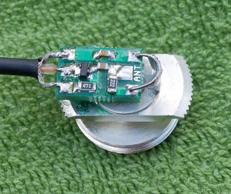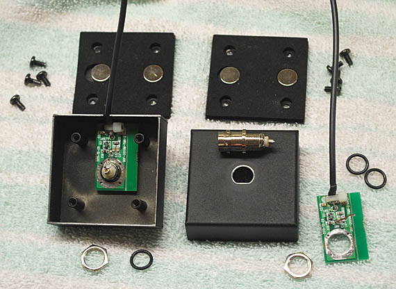 4. Remove the nut from the BNC connector and push the connector out the top. Be very careful not to damage the components on the circuit board while doing this. Then pull the little circuit board and coax out of the whip base.
