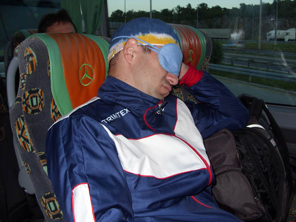 Vadim Afonkin KB1RLI decided that the bus was a good place to sleep. (WM5R)