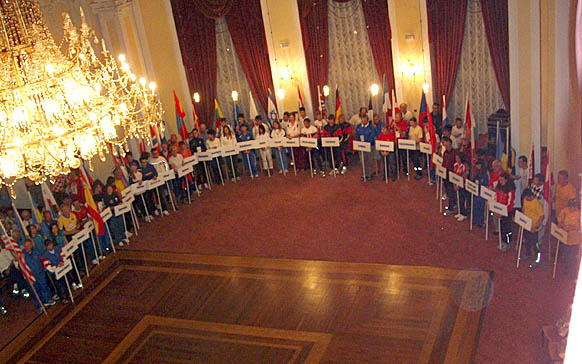 At the opening ceremony, a view from the balcony of all of the team representatives with their flags and signs. USA is at the far left. (WB6RDV)