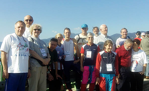 Team USA members and officials relaxing at a stop on the way to the Model Event on September 14. Back row: Dick Arnett, Harley Leach, Karla Leach, George Neal, Alla Mezhevaya, Vadim Afonkin, Jerry Boyd, Bob Cooley, Dennis Schwendtner, Jay Hennigan. Front row: Ruth Bromer, Lori Huberman, Marvin Johnston, Kuon Hunt. Competitors not pictured: Dale Hunt, Jen Harker, Ken Harker. (KE6HTS)