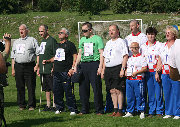 Some of the blind competitors lined up for a photo. Dennis Schwendtner WB6OBB is wearing bib #4. (KE6HTS)