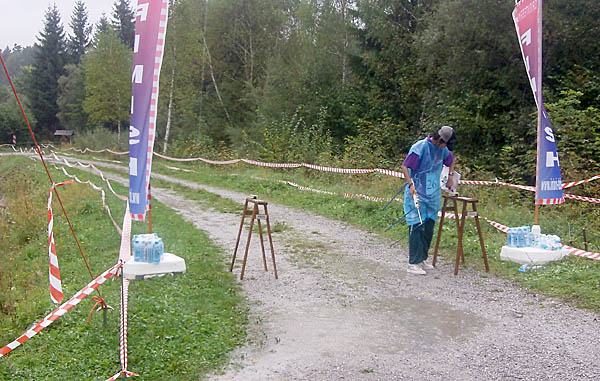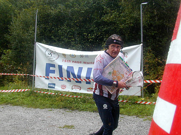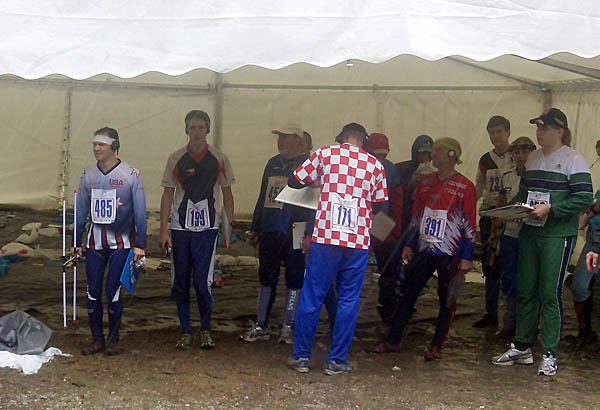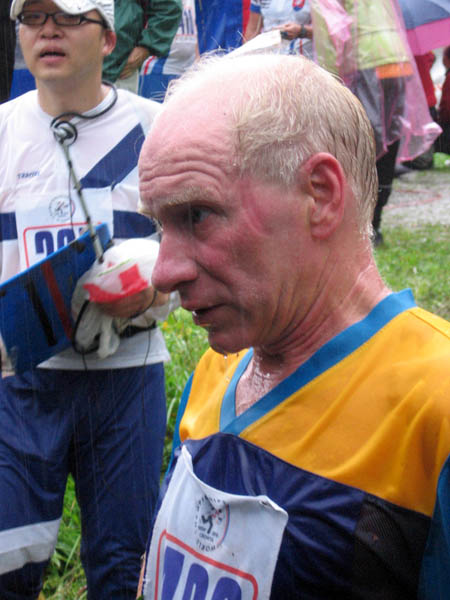 Nikolay Ivanchihin UR8UA of Ukraine dries off after his 11th place finish on 80 meters in M50. Two days earlier, he was the gold medalist on two-meters in his category. Nick was a visiting competitor at the 2009 USA ARDF Championships near Boston where he won two gold medals. Behind Nikolay is Kentaro Kurogi JL4NDN, who also came to the 2009 USA championships in Boston. (WB6BYU)