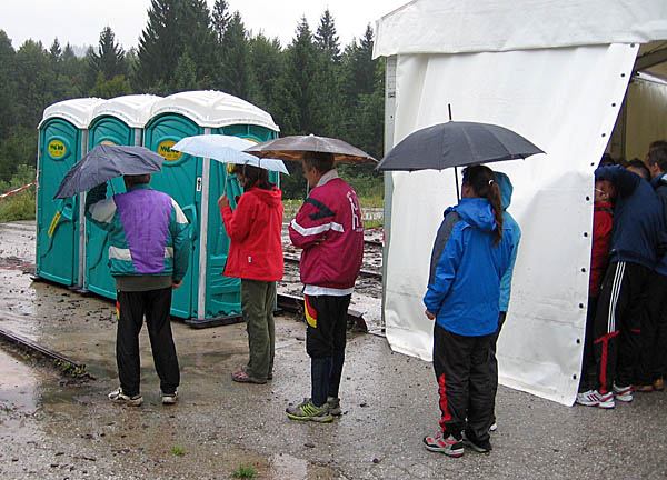 Waiting in the rain for a turn in the portapotty. (WB6BYU)