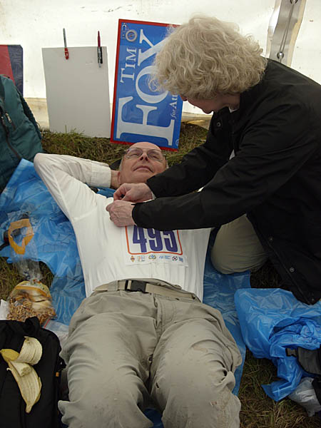 Harley Leach KI7XF gets a little TLC from Karla Leach KC7BLA as they wait for their starting times. (WM5R)