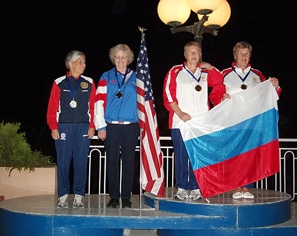 Ruth Bromer WB4QZG and Karla Leach KC7BLA took second place among national teams in category W60 on two meters. Here they are with the USA flag and their silver medals on the podium of the first awards ceremony. To the right of them are the gold medal winners in that category, from Russia. (WB6RDV)